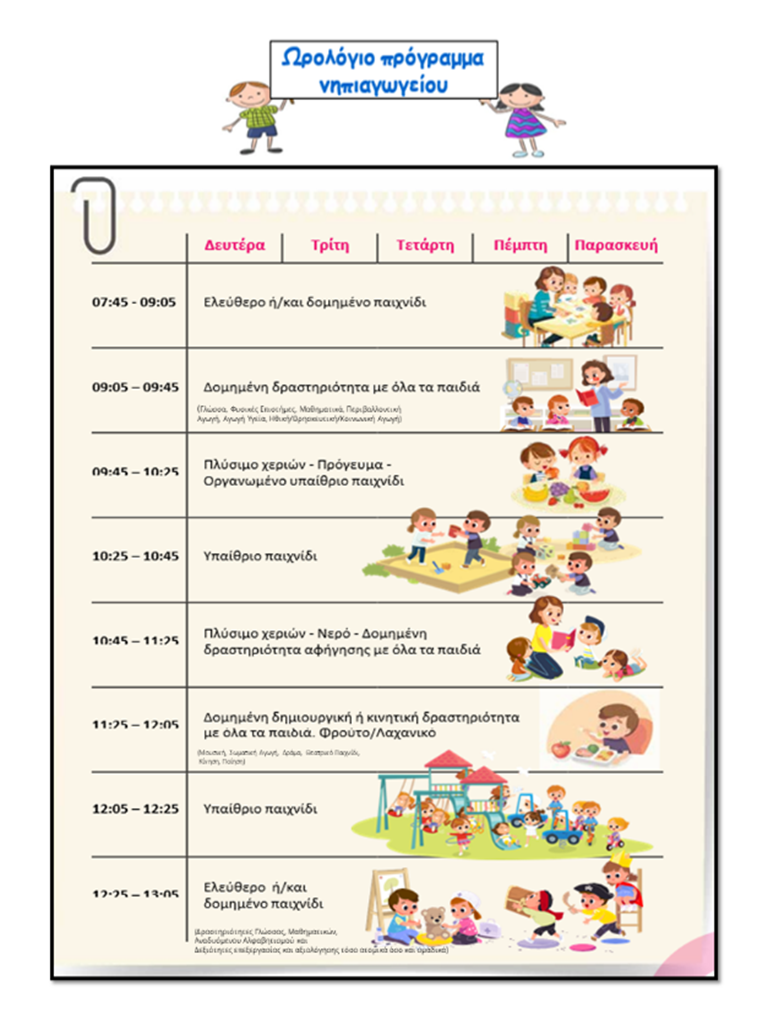 Το ωρολόγιο πρόγραμμα του νηπιαγωγείου είναι ευέλικτο και η νηπιαγωγός έχει τη δυνατότητα να επιλέξει το θεματολόγιό της, να τροποποιήσει τον ημερήσιο προγραμματισμό της σύμφωνα με τις ανάγκες και τα ενδιαφέροντα των παιδιών της τάξης της και την ιδιαιτερότητα της σχολικής μονάδας. Προσπάθεια της νηπιαγωγού είναι η ισόρροπη κατανομή των θεμάτων έτσι ώστε τα παιδιά να επιτυγχάνουν τους γενικούς σκοπούς και στόχους της εκπαίδευσης.