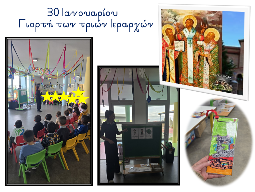 Στις 30 Ιανουαρίου, γιορτάζουμε μια πολύ σημαντική χριστιανική γιορτή εις τη μνήμη των Τριών Ιεραρχών. Γιορτή των Γραμμάτων, μιας και οι Τρεις Ιεράρχες «Ο Μέγας Βασίλειος, ο Ιωάννης ο Χρυσόστομος και ο Γρηγόριος ο Θεολόγος», ήταν Μεγάλοι Δάσκαλοι αλλά και Πατέρες της Εκκλησίας. Ήταν ευσεβείς Ιεράρχες, επιφανείς θεολόγοι, με κοινωνική προσφορά και φιλανθρωπικό έργο, που διέθεσαν τη ζωή τους στην πίστη τους για το Χριστό. Ευχαριστούμε θερμά τη νηπιαγωγό κα. Φρόσω Έλληνα και τα παιδιά της Α2 τάξης για την παρουσίαση, αναφέροντας σημαντικές πληροφορίες στα παιδιά για το βίο και την προσφορά τους στην ανθρωπότητα.