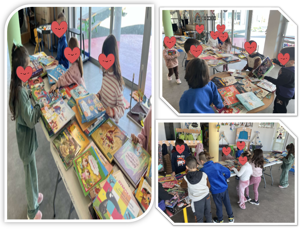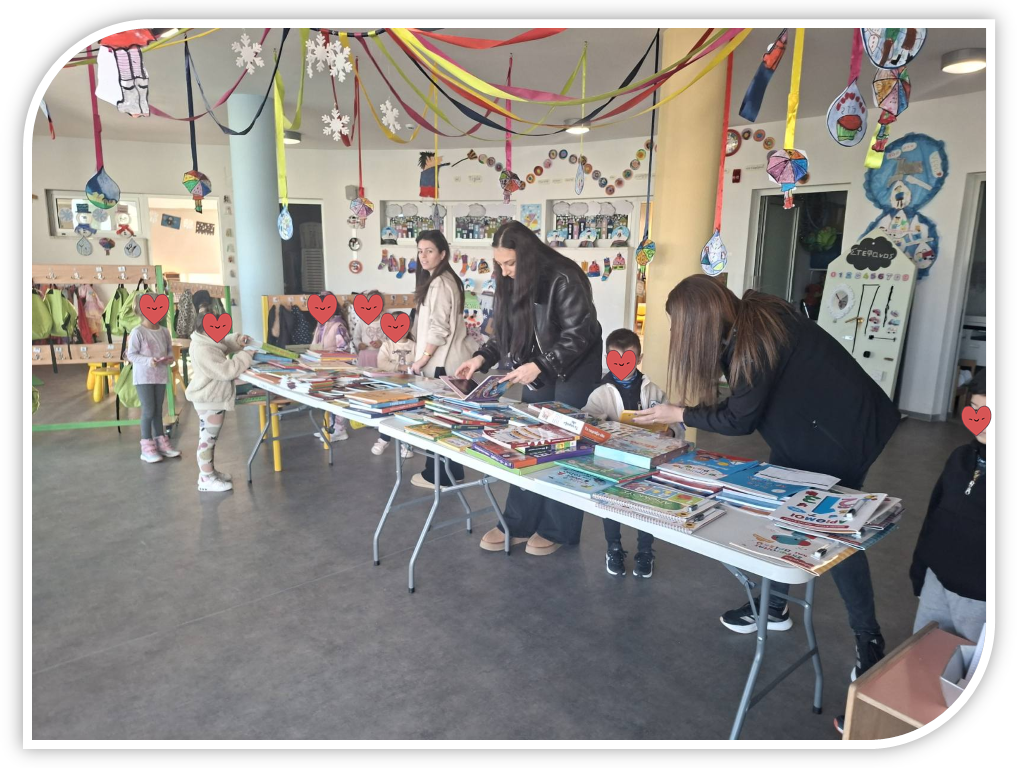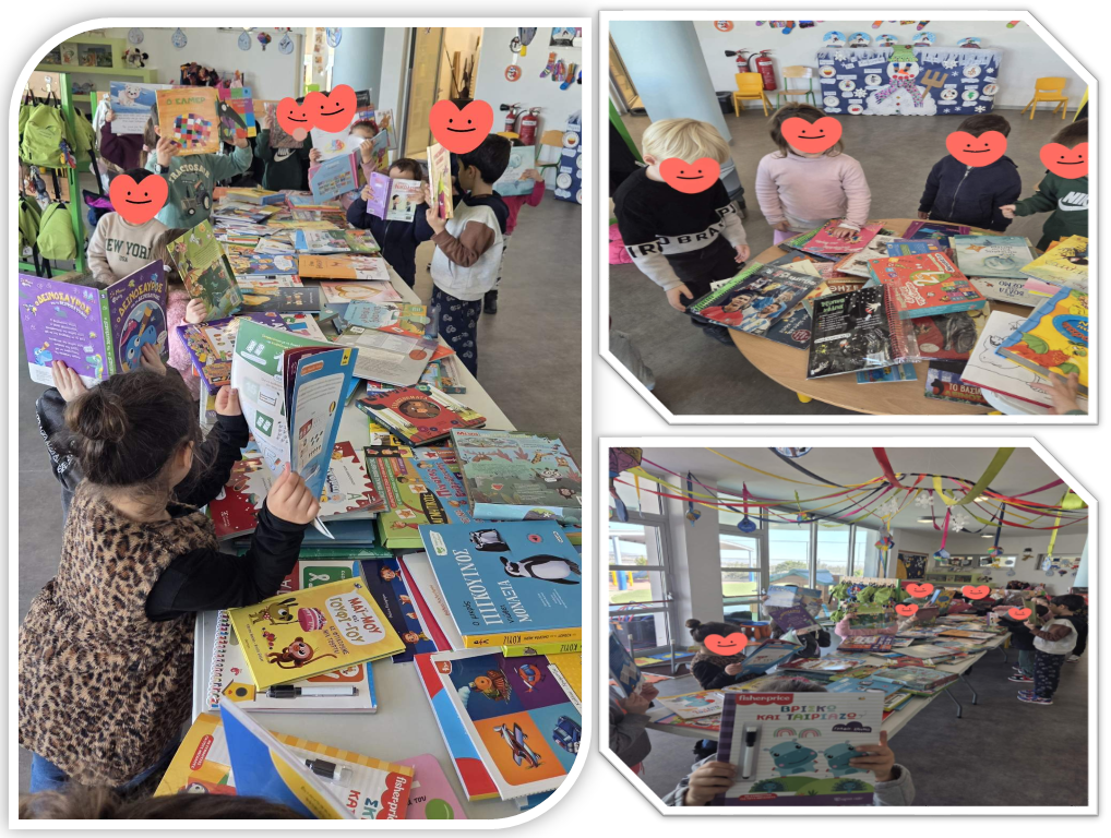 Οι μαθητές και οι μαθήτριες του νηπιαγωγείου επισκέφθηκαν την Έκθεση βιβλίου στον χώρο του σχολείου μας, μετροφύλλησαν τα διάφορα είδη βιβλίων(παραμύθια, προγραφικές-προμαθηματικές- προγραφικές ασκησούλες, κλπ) και μαζί με τους γονείς τους συμπλήρωσαν συγκεκριμένο έντυπο για να παραγγείλουν τα βιβλία που τους κίνησαν το ενδιαφέρον. Χαιρόμαστε να βλέπουμε τα παιδιά με τα βιβλία στα χέρια, αφού όπως είπε χαρακτηριστικά και ο Walt Disney: «Υπάρχει περισσότερος θησαυρός στα βιβλία από ό,τι σε όλα τα λάφυρα των πειρατών στο Νησί του Θησαυρού!»
