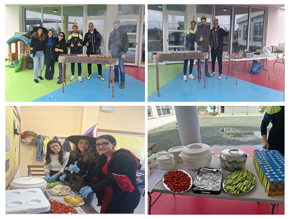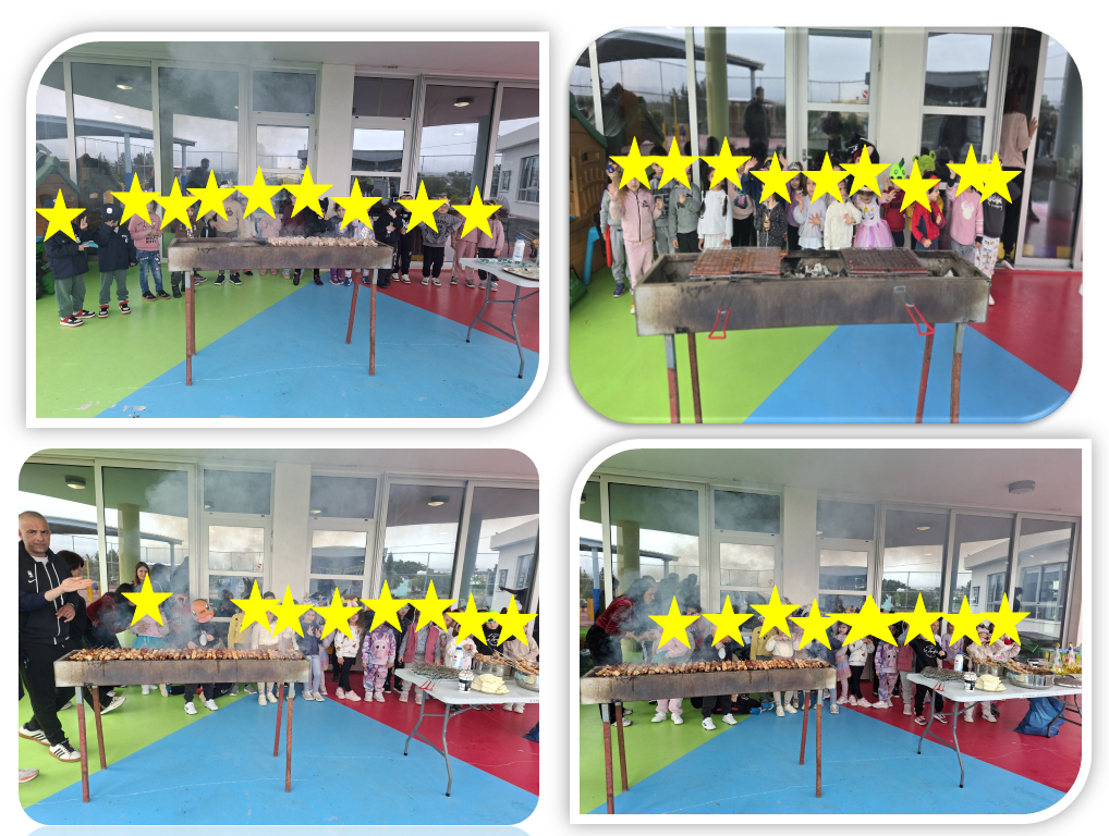 Από νωρίς το πρωί καλημερίσαμε τα παιδιά με αποκριάτικους χαρούμενους ρυθμούς. Στην αυλή του Σχολείου μας στήθηκαν οι ψησταριές από την αχτύπητη ομάδα του Συνδέσμου Γονέων, όπου με πολύ κέφι και καρναβαλική διάθεση τσικνίσαμε νοστιμότατα σουβλάκια, λουκάνικα, χαλούμια, πίτες, κά.