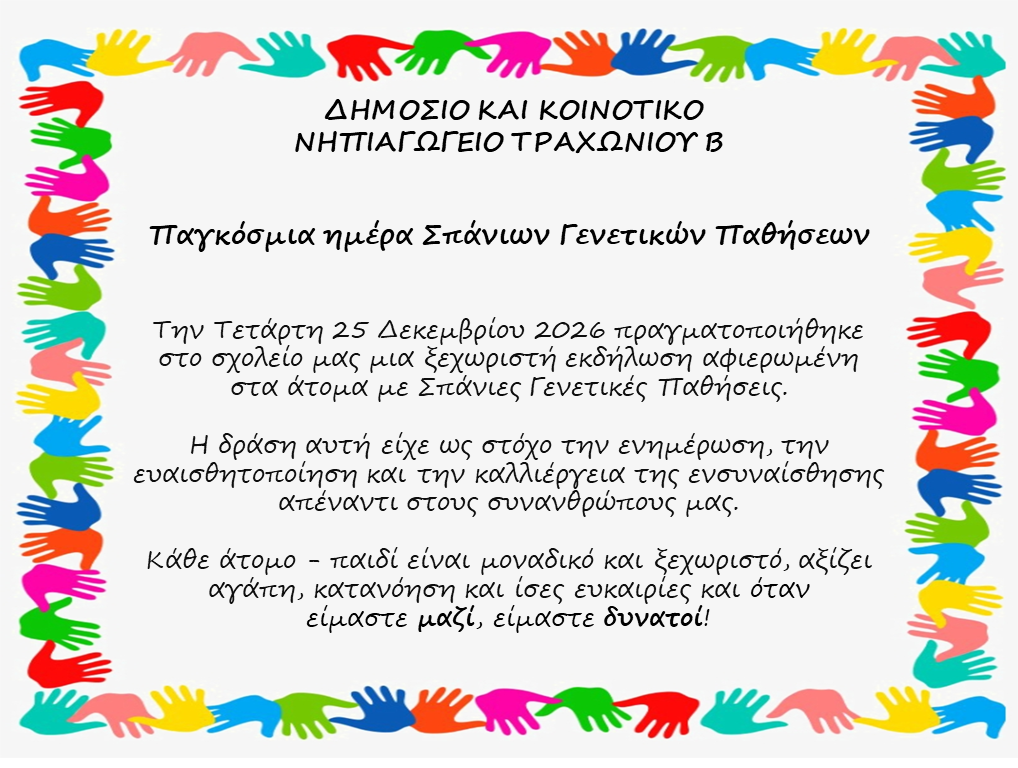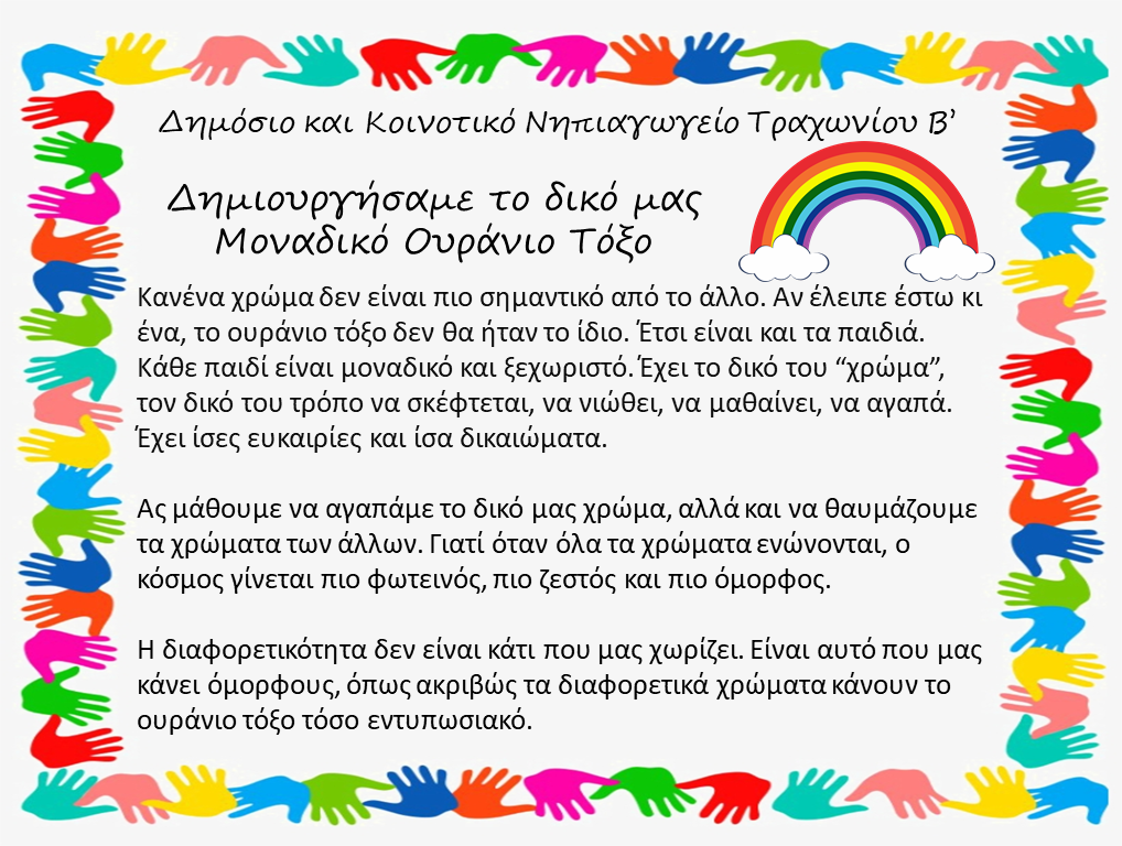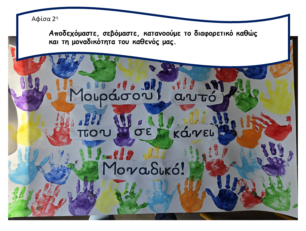 Τα παιδιά και το προσωπικό του νηπιαγωγείου κάλεσαν τους γονείς να έρθουν στην εκδήλωση και μέσα από τις ζωγραφιές, τα ποιήματα που απήγγειλαν και τα τραγούδια που τραγούδησαν, μετέφεραν όμορφα μηνύματα για την αποδοχή και το σεβασμό προς τη Διαφορετικότητα.
