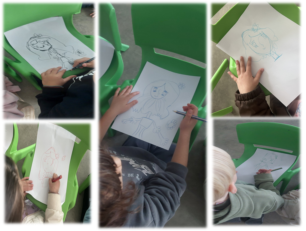 Τέλος, αξιοποιήσαμε μια βιντεοσκοπημένη παρέμβαση από την εικονογράφο του βιβλίου, η οποία μας έδειξε βήμα-βήμα πώς να ζωγραφίσουμε την ηρωίδα του παραμυθιού. Τα παιδιά ενθουσιάστηκαν ιδιαίτερα και το αποτέλεσμα της δραστηριότητας ήταν πραγματικά υπέροχο.